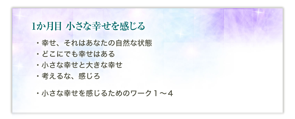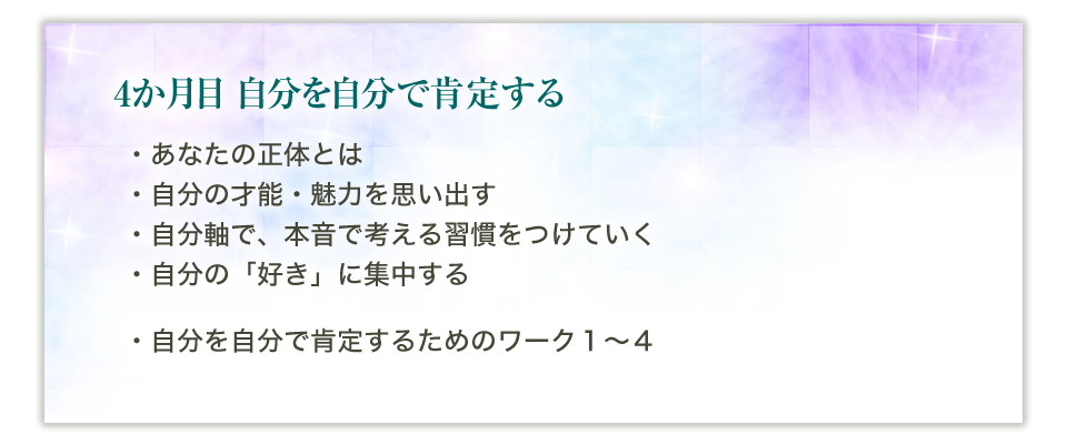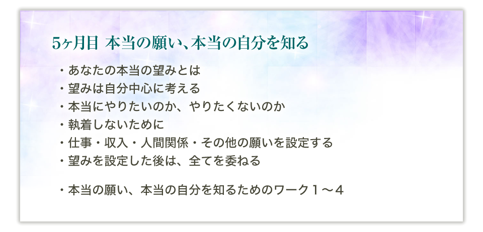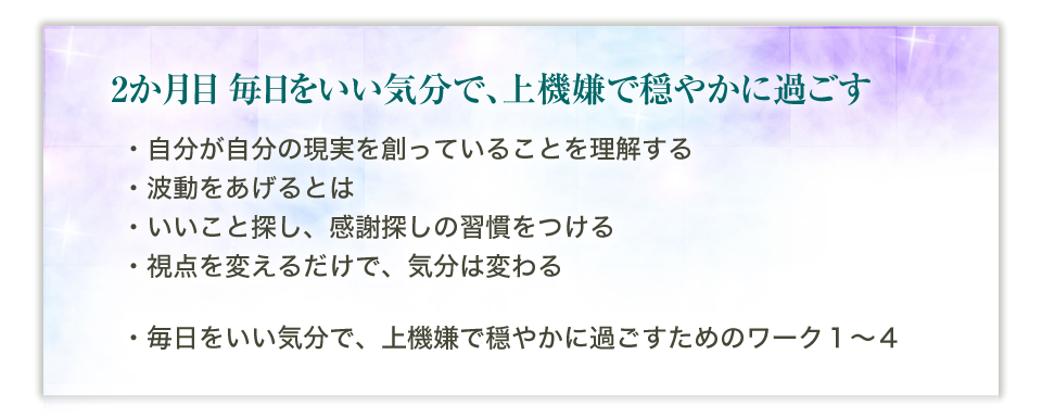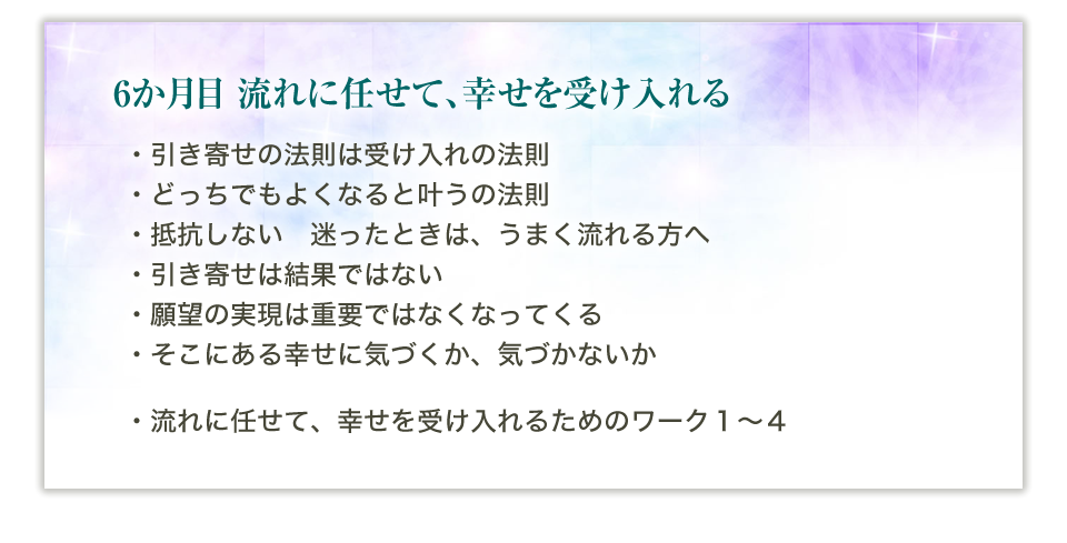 6か月の間、毎月のテーマがあります。そのテーマに沿って、あなたは波動をあげていくために必要なことを学び、実践するにつれ、引き寄せ体質になっていくことでしょう。 正しい知識と順番を学ぶことで、何から始めればよいのか、お伝えしていきます。
