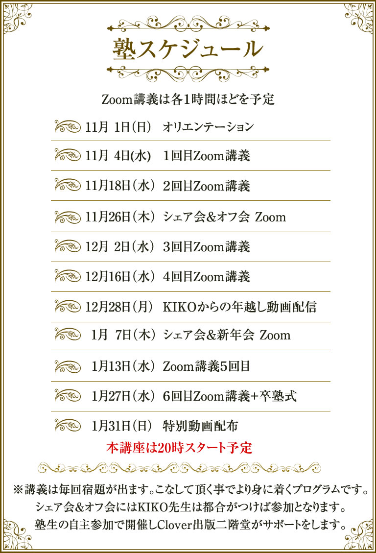 プログラムのコンテンツは3ヶ月間です。2021年1月31日(日)[卒塾式]で終了となります。